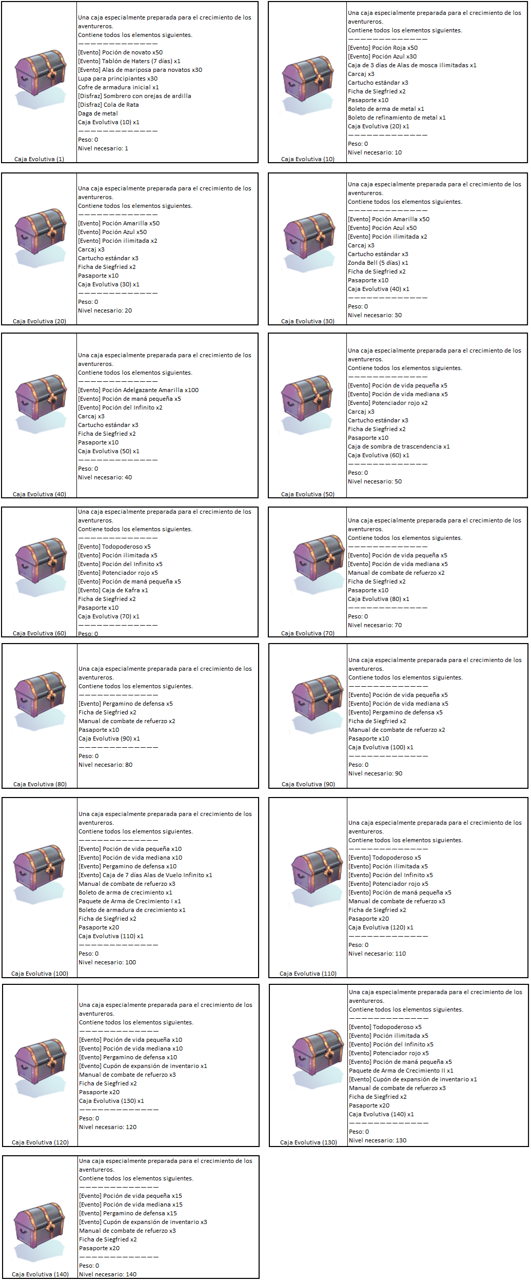 - Aconsejamos que la Caja Evolutiva (1) sea reclamada por personajes de [Nivel Bajo], ya que concede ítems que ayudan en la evolución del personaje