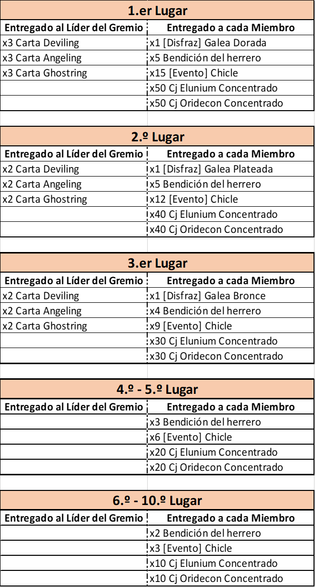 Los miembros de los clanes que obtuvieron el 1.º, 2.º y 3.º lugar también recibirán Cajas de Elunium Enriquecido y Cajas de Oridecon Enriquecido, las cuales no formaban parte del paquete original.