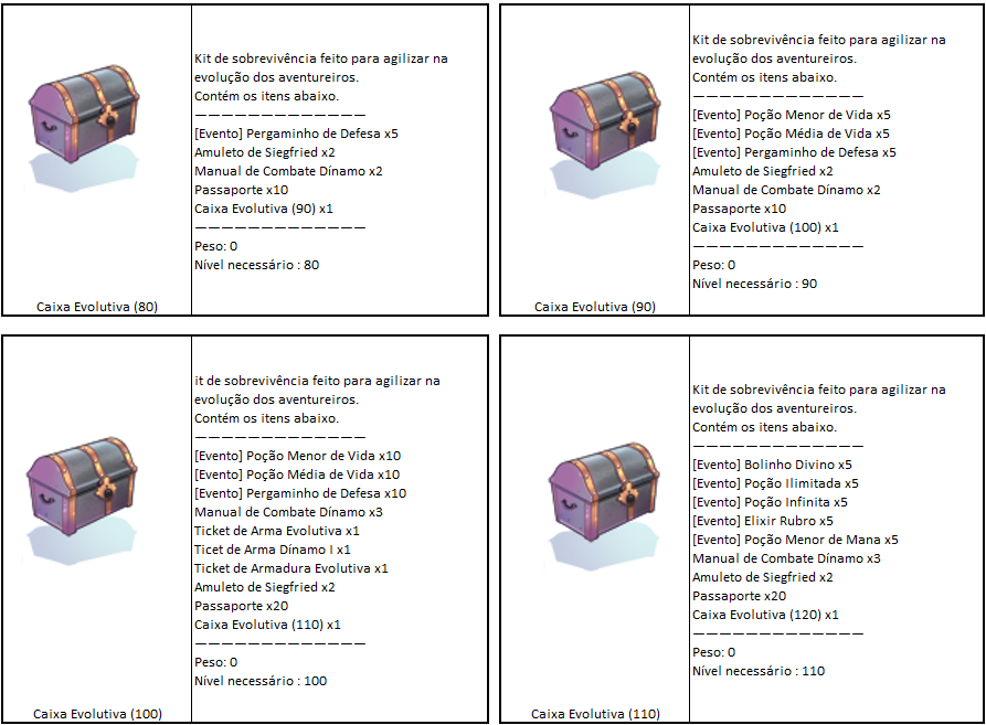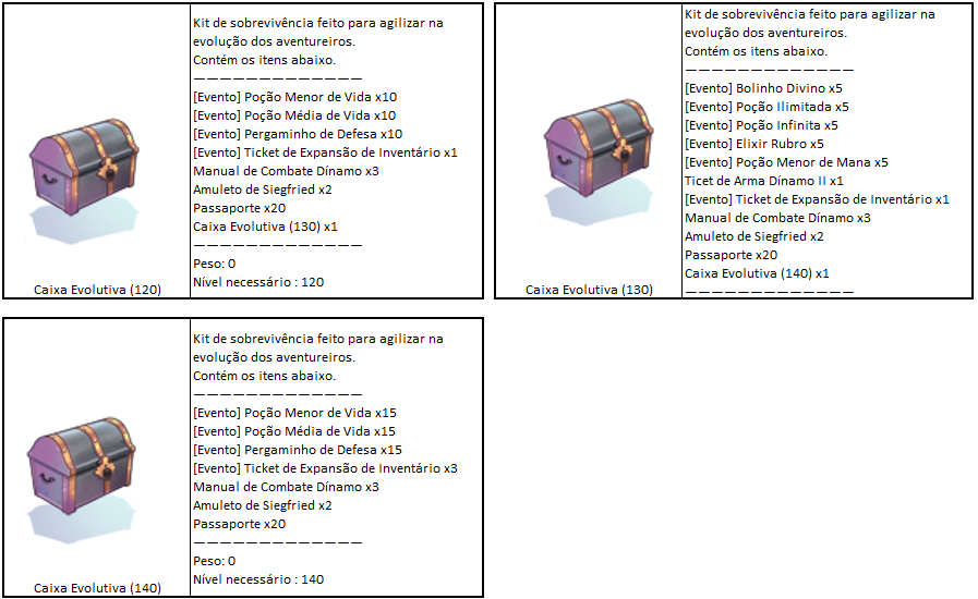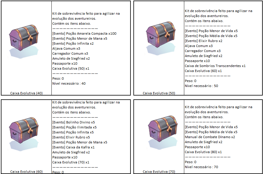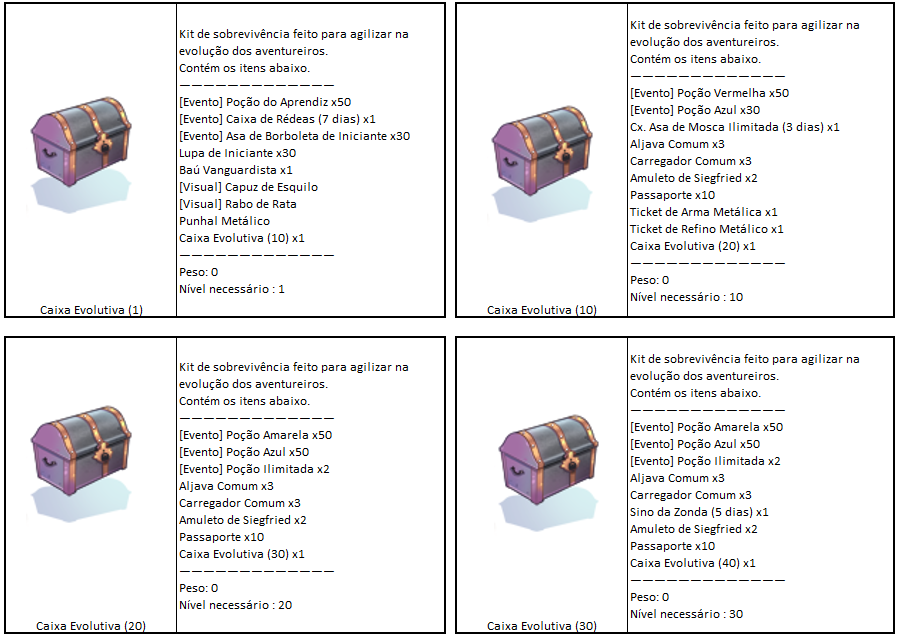 - Aconselhamos que a Caixa Evolutiva (1) seja resgatada em personagens de [Nível Baixo], já que concede itens que ajudam na evolução do personagem.